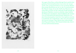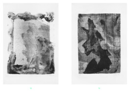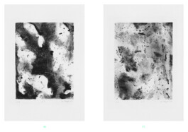 Wie an einem Tagebuch hat Myriam Mayer in den Jahren 2020 und 2021 an zwei parallel laufenden Lithografieserien gearbeitet. Insgesamt 54 Arbeiten sind in diesem Zeitraum entstanden, die sich aufeinander beziehen und trotz zweier unterschiedlicher Formate eindeutig zusammengehören. Diese Zusammengehörigkeit entsteht erst einmal formal durch die monochrome schwarze Druckfarbe, durch wiederkehrende Formen und Strukturen und die Ausfüllung des Bildraumes. Als Konvolut, in einer Reihe gehängt oder zusammenhängend im Buch abgedruckt, wird der Zusammenhang der einzelnen Blätter und ihr Aufbau als Serie deutlich. In Myriam Mayers Publikation „Tell me something good“, erschienen im Lubok Verlag, sind alle 54 Lithografien enthalten. In Kontext gesetzt werden sie mit kurzen Prosatexten von Nina Heller, Alltagsbeobachtungen in erster Person geschrieben, die den Tagebuchcharakter der Drucke verstärken.